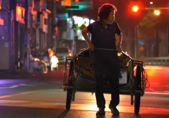 ▼奶奶得知這件事後很自責,認為是自己的職業影響了宰浩的交友。她出門撿回收時就騙宰浩說自己要去老人院參觀,讓孫子待在家裡。但宰浩知道奶奶的心意,還是堅持陪她一起去撿回收。鄰居們都認識這對祖孫,會將家裡不要的廢紙與回收物整理好放在路口。