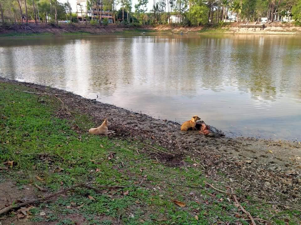 ▼老婦人旁邊有2隻狗狗,一隻陪伴在她身邊,另一隻則趴在稍遠一些的地方守望。狗狗們身上也沾有淤泥,應該陪在老婦人身邊好一會兒了。附近的居民說,那條河並不安全,泥灘上經常有巨蜥或鱷魚出沒,狗狗們也許是擔心老婦人,才會守在旁邊的。