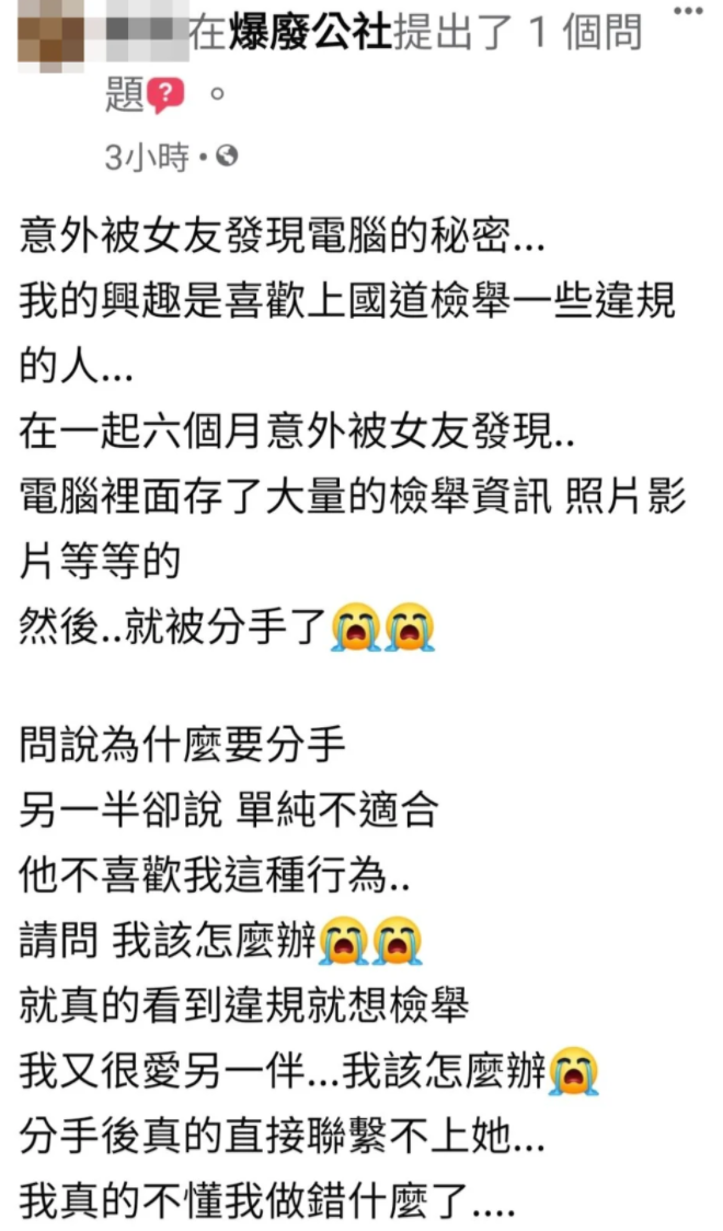 2021年09月08日你能接受另一半是「檢舉達人」嗎?日前一名男網友在臉書社團「爆廢公社」發文說,他的興趣是「喜歡上國道檢舉一些違規的人」,電腦裡存有大量交通違規的照片、影片等檢舉資訊。女友發現後竟提出分手,這讓他非常崩潰,實在難以接受~