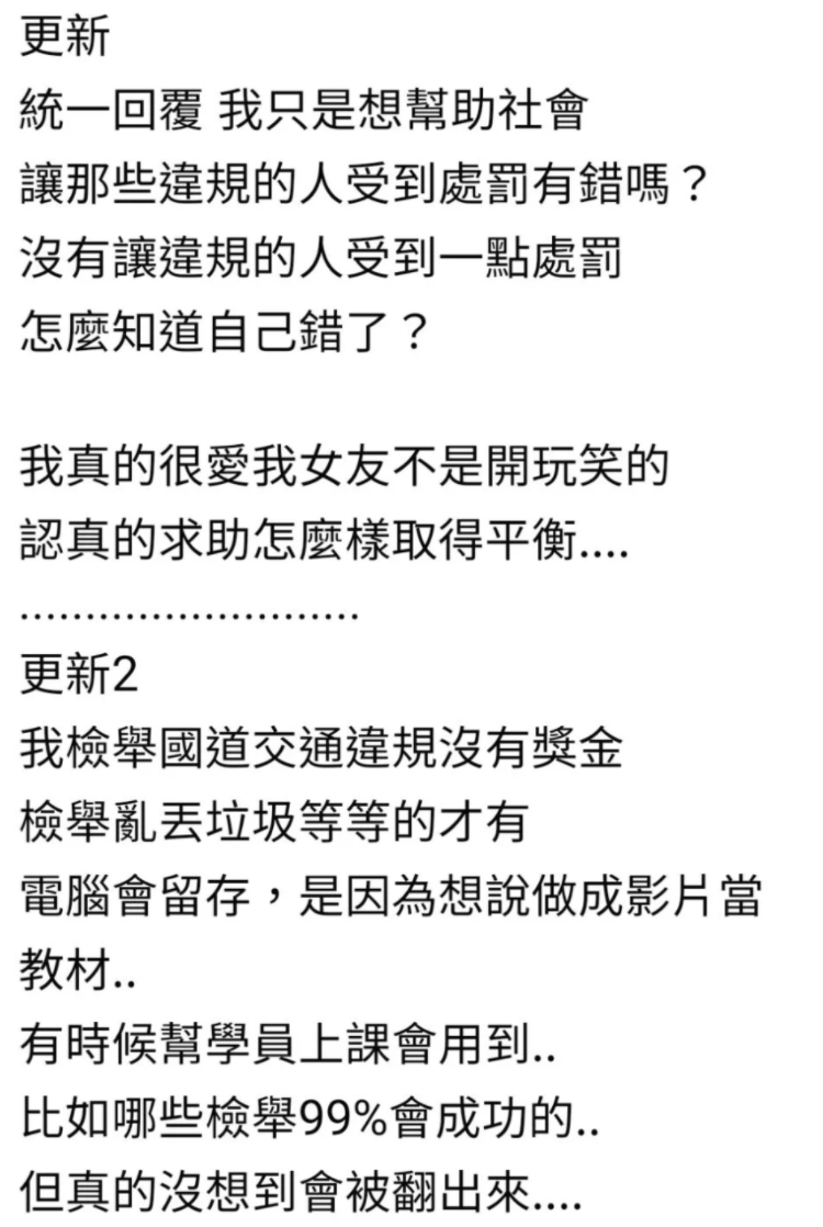 ▼原po看到很多網友指責自己,補充說自己的做為「只是想幫助社會,讓那些違規的人受到處罰」,而且檢舉交通違規沒有獎金,電腦的留檔是想當成教材,有時候幫學員上課會用到。他再次強調,自己真的很愛女友,所以想請教如何取得平衡。