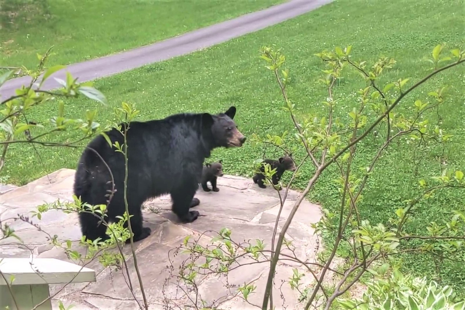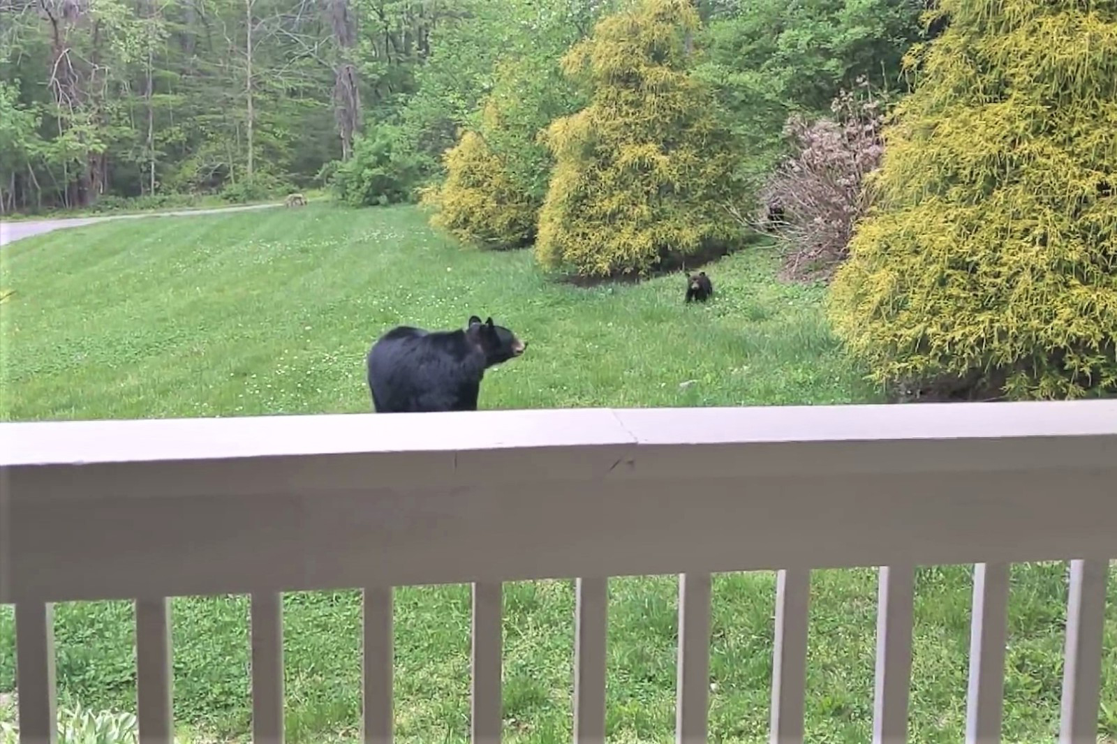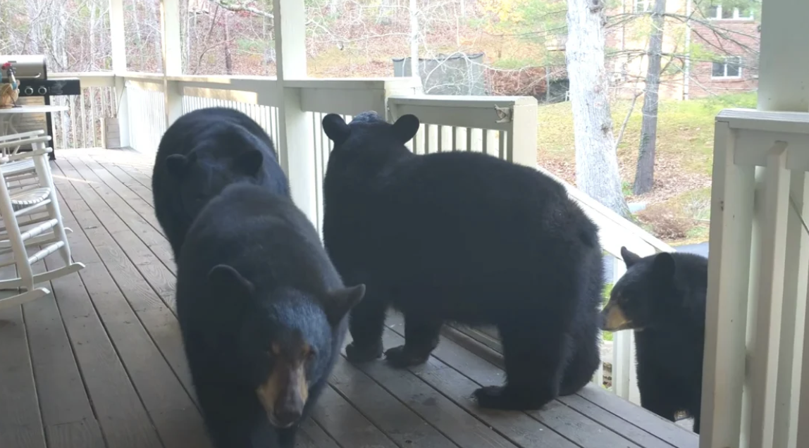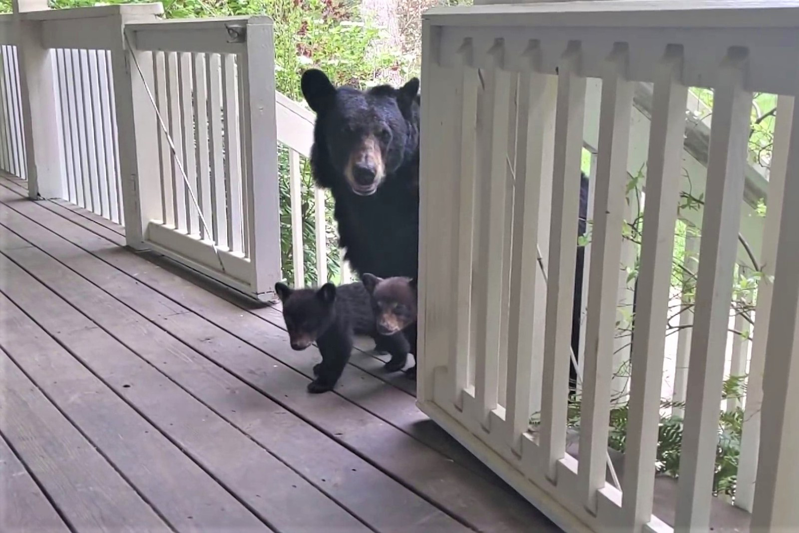 ▼現在3隻小熊已經長大,但黑熊一家還是會來拜訪Patrick。其中熊女兒Simone格外友善,牠有時候會跑到Patrick家的門廊上玩耍。今年5月初,Simone當了媽媽,牠特別帶著自己的孩子們到Patrick家來拜訪,就像當年熊媽媽帶著牠們來拜訪一樣。