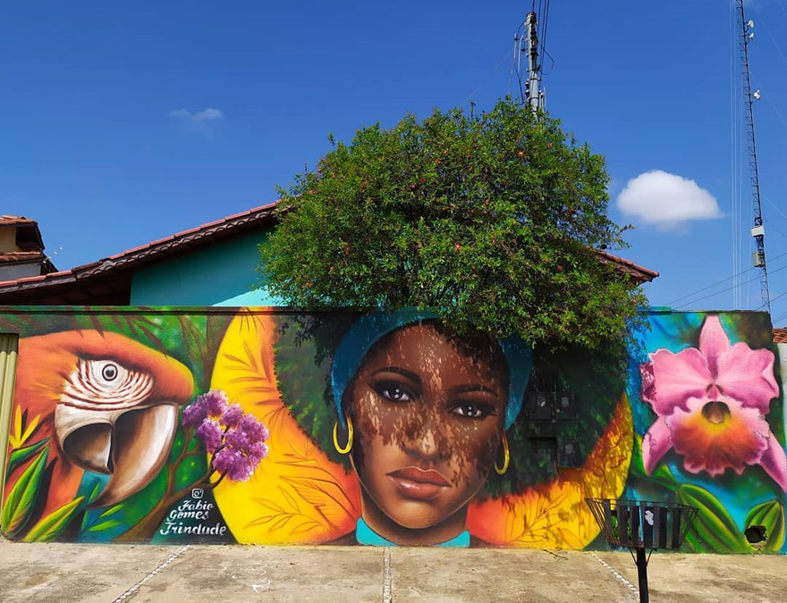 ▼Fábio Gomes Trindade非常有創意,他用滿滿的熱情,在牆壁上畫出一張張美麗的臉。結合周圍的花草樹木,就有了有趣的髮型。這樣的作品能給人帶來數不盡的驚喜。