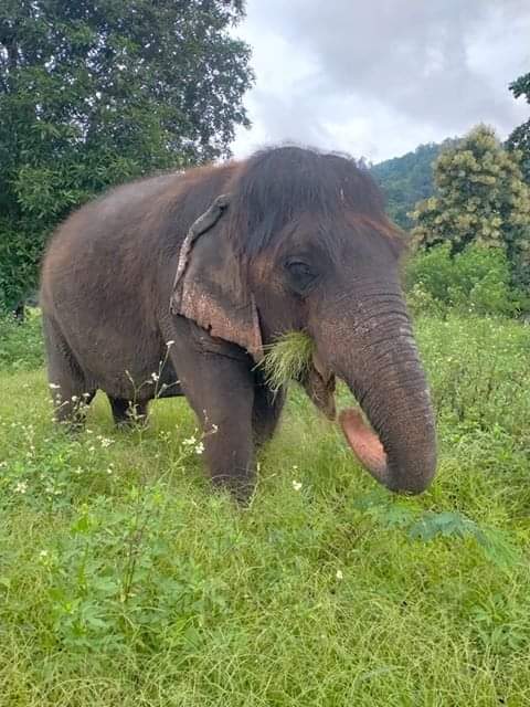 ▼邦媽頭上的毛髮垂下來蓋在臉上,就像瀏海一樣,顯得非常年輕。其實牠已經70多歲,是一隻大象奶奶啦。牠從湄登的大象園區退休,目前正在養老院過著悠閒的生活,每天散散步、曬曬太陽、享受美食,非常愜意。