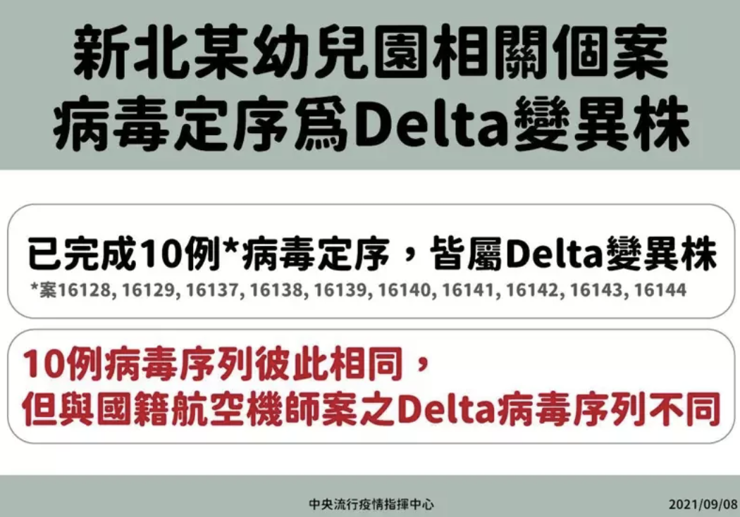 2021年09月09日新北幼兒園群聚案例擴大,昨天(8日)再新增7人確診,其中已有10人基因定序出爐,確定為Delta變異株。指揮中心指揮官陳時中表示:「若民眾近期有出現一點點類似感冒症狀,不要覺得好像沒什麼,一定要請假在家不要去上班上課。」