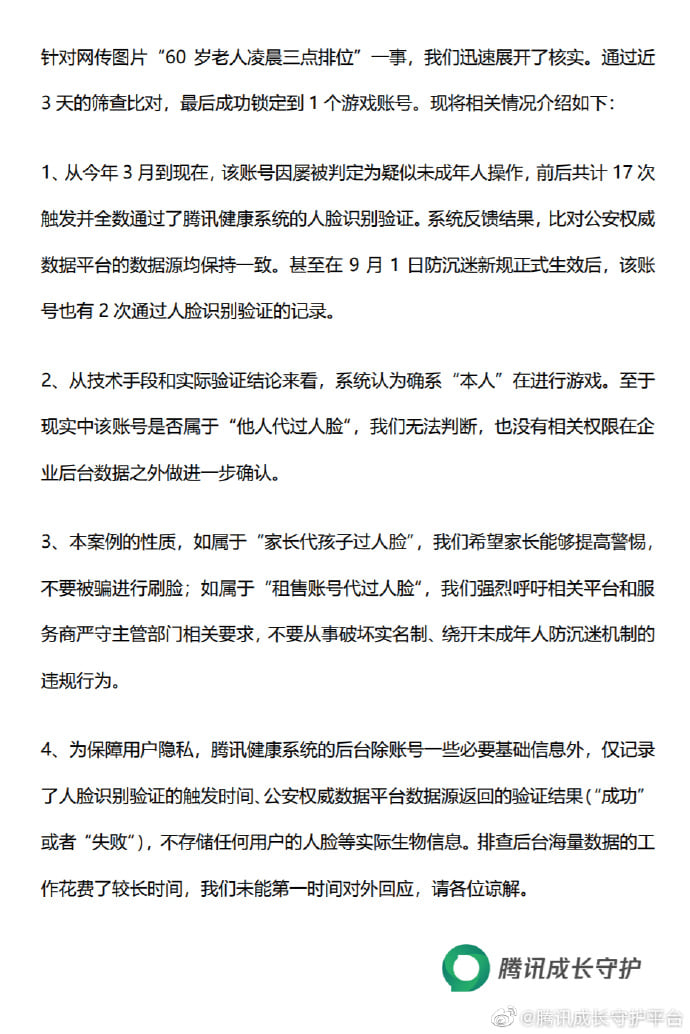 ▼騰訊鎖定一個吻合的遊戲帳號,該帳號由3月份開始多次被質疑是未成年在使用,但健康系統對該帳號進行17次人臉識別驗證,結果都通過了。從技術層面來說,使用這一帳號的應該就是老奶奶本人。騰訊對這件事做出詳細的回應: