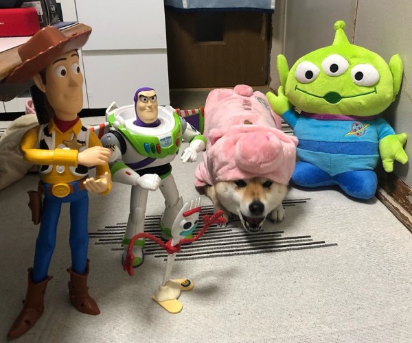 ▼主人喜歡將牠裝扮成不同的角色,比如《玩具總動員》裡的粉紅豬「火腿」: