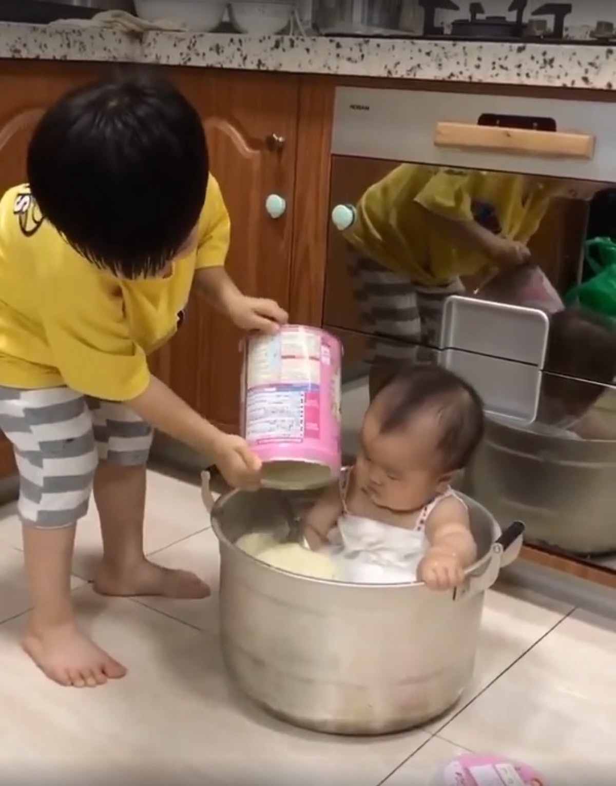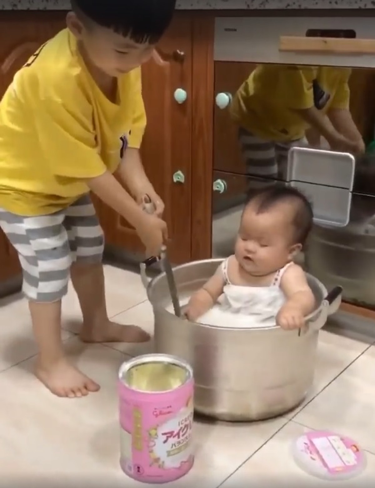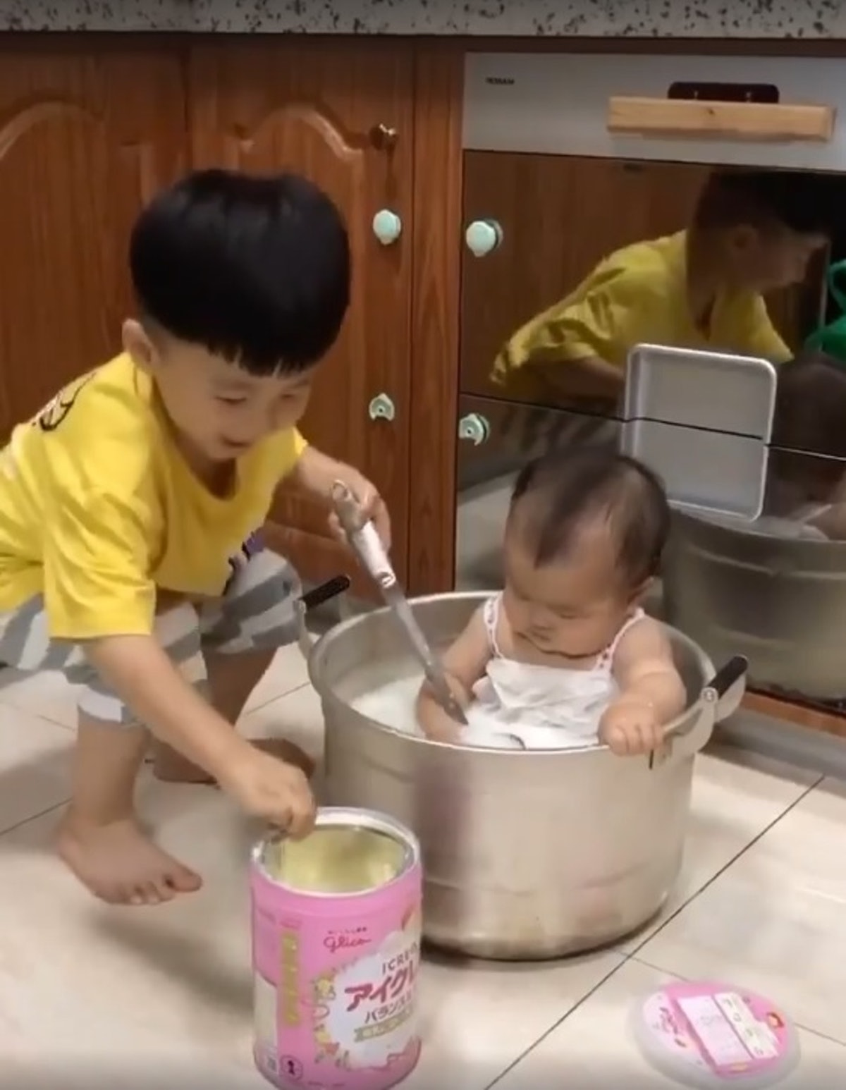 ▼有網友在臉書社團裡分享一則短片,並以小孩子的逗趣口吻說媽媽已經三天沒有懲罰他了,表示影片中的小男孩行徑簡直是「皮在癢」了。影片中一位小女嬰坐在大湯鍋子裡,看著身旁的哥哥正在很「勤勞」的將一整罐的奶粉倒進湯鍋中,並且一次倒沒完,還繼續倒第二次,灑了滿地的奶粉,接著又繼續拿起大湯勺,準備要讓妹妹洗一洗正統「牛奶浴」。