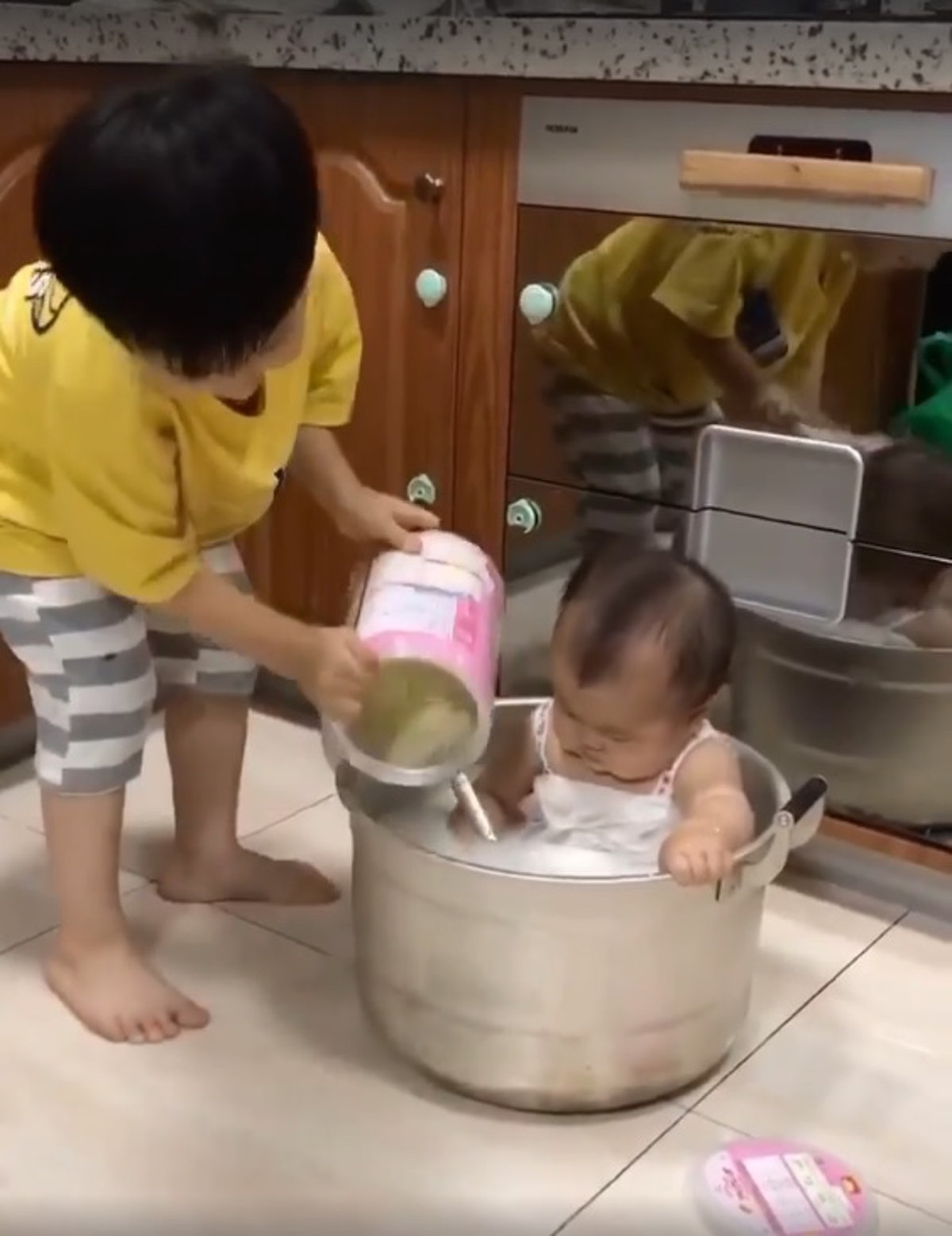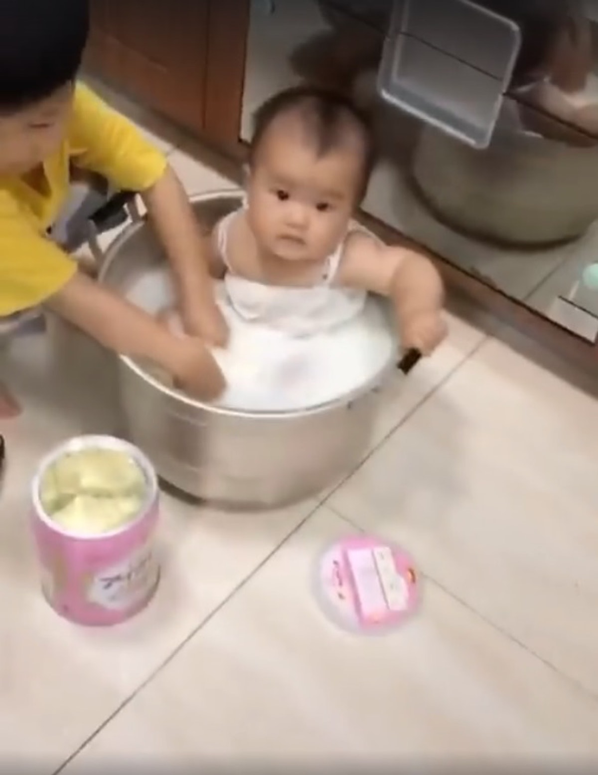 皮在癢!調皮哥「倒整罐奶粉」給妹妹「洗牛奶浴」 網笑翻:媽媽在你背後很火