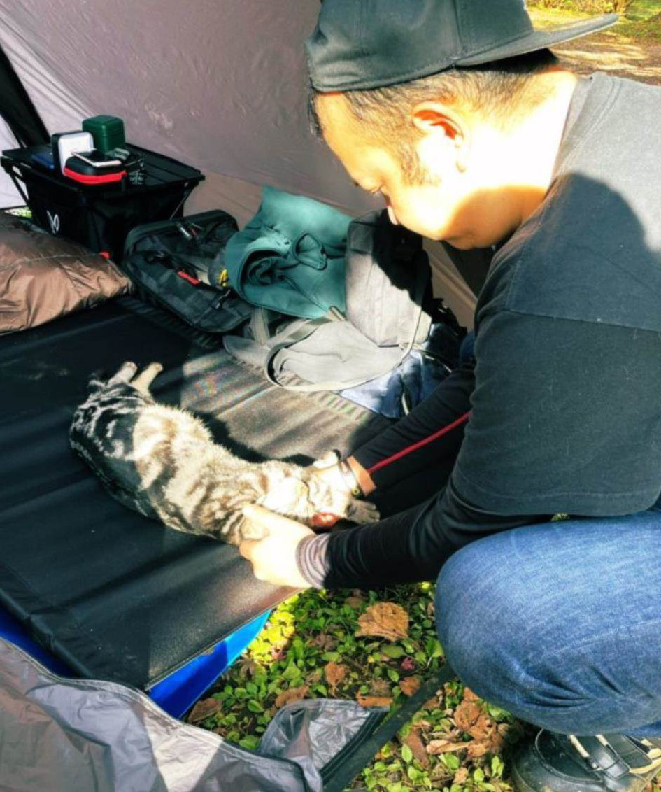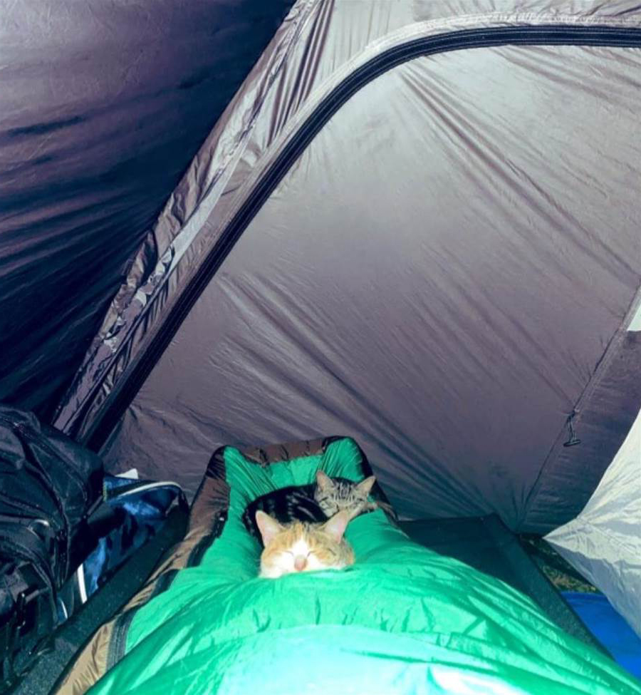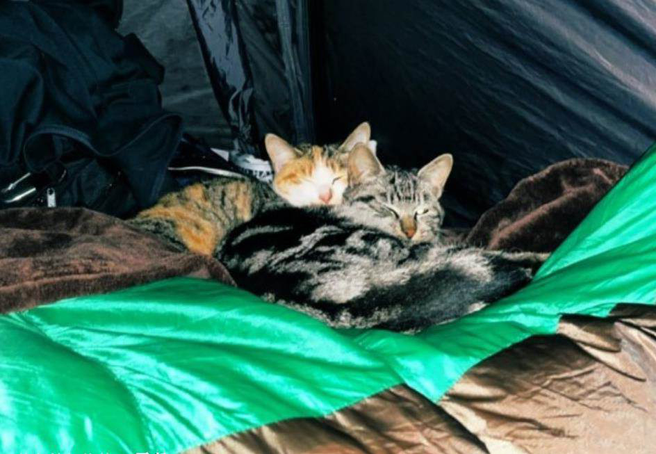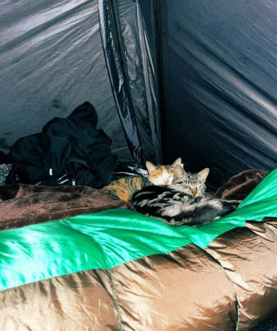 ▼這2隻貓咪睡了一個好覺,第二天網友收拾帳篷的時候,牠們還賴在裡面不想離開。看到牠們撒嬌的模樣,網友很想收編牠們,但來之前沒有任何準備,沒辦法將牠們帶回家,只能有緣下次再見了。