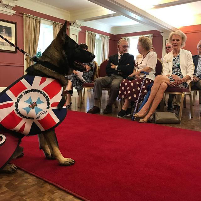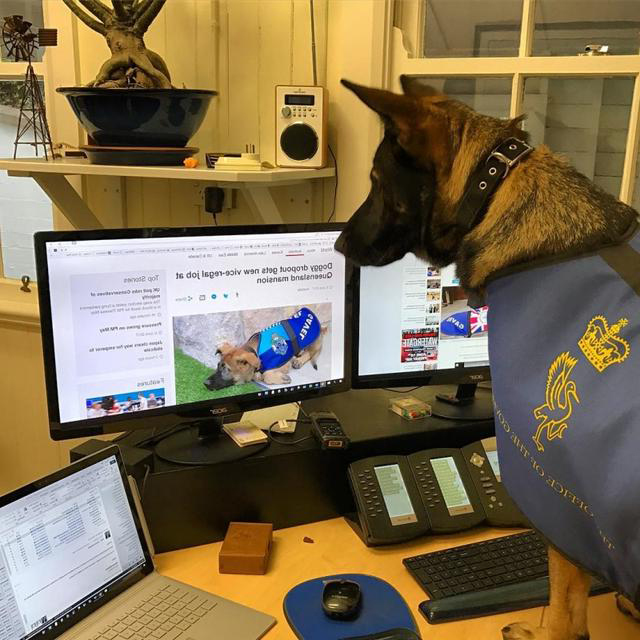▼對賈維爾來說,這份工作非常合適!牠穿著帥氣的制服,每天在房子裡巡邏、接待來賓、在宴會中給人們帶來歡樂。賈維爾跟以前一樣可愛,就算見到高官,牠也會露出肚肚討摸摸。高官們也很喜歡這隻親人的狗狗,待牠非常親切。