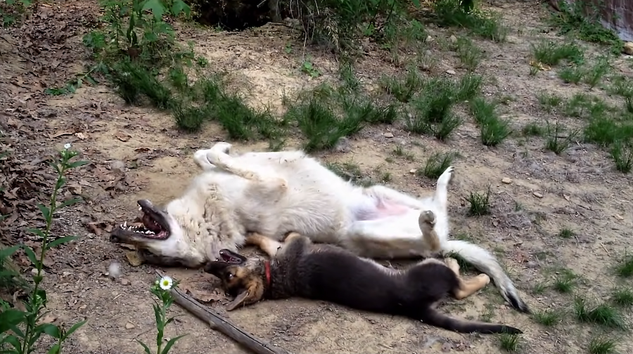 果然就是比較大的狗!狼與小德牧玩耍 太開心還滾到地上「一起哈哈大笑」