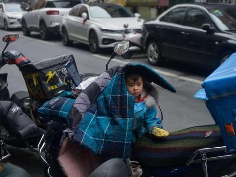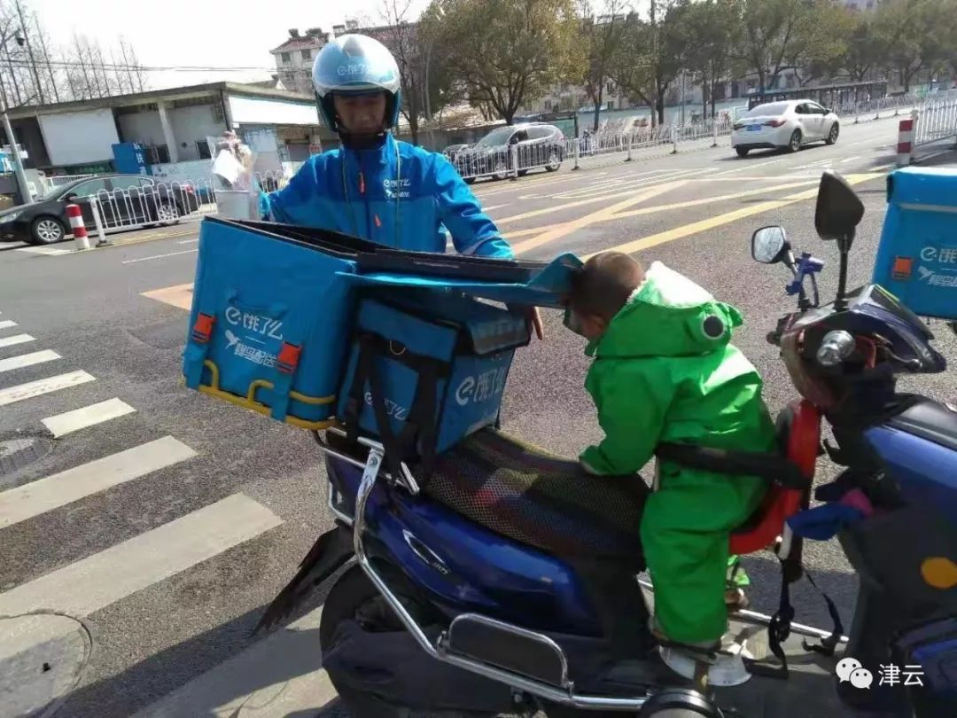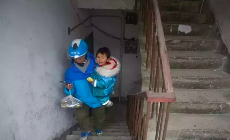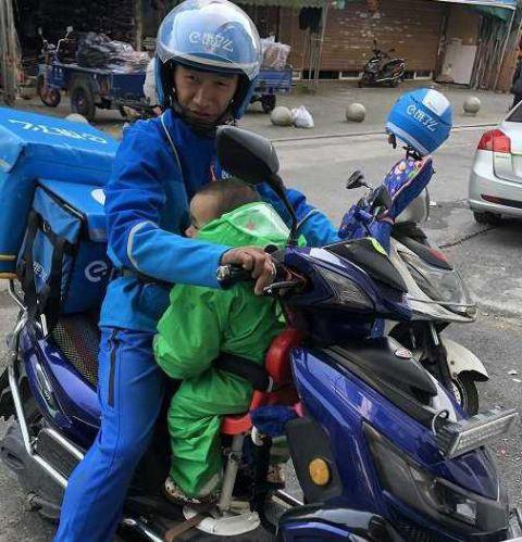▼李幫勇在送餐給客人的時候,若是在他的視線範圍內,他就會讓女兒坐在安全座椅上;步行送餐時,他就會一手抱女兒、一手取餐點,有次因為等不到電梯,他還抱著女兒爬上17層樓梯,因為他表示:「不能因為我帶著孩子,就讓點外賣的人多等。」