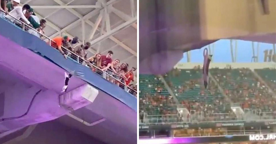 2021年09月14日日前美國邁阿密的一場橄欖球賽上出現了驚險的一幕。一隻貓咪不知為何出現在觀眾席上,牠可能受到驚嚇,竟不小心竄出,差點從上層看台墜落,只能用爪子鉤住廣告帷幕,在高空掙扎、擺盪。現場的觀眾看到這一幕都忍不住驚叫起來。