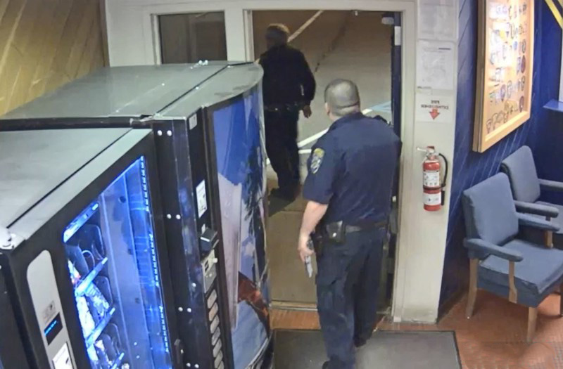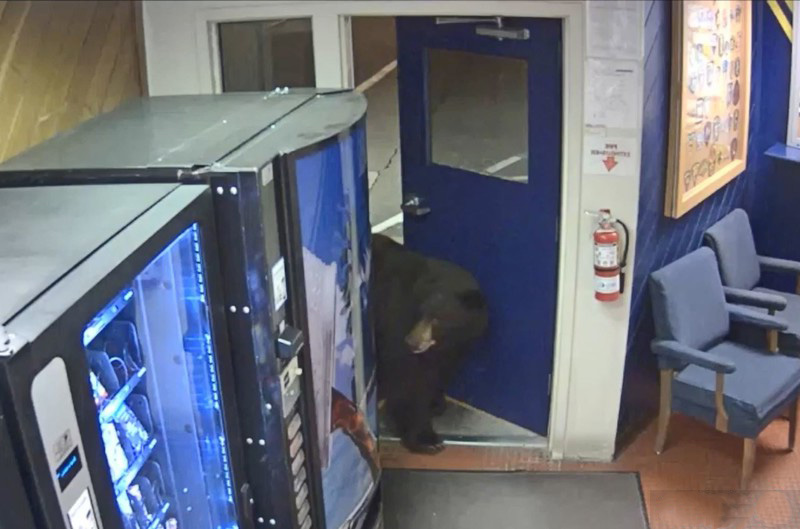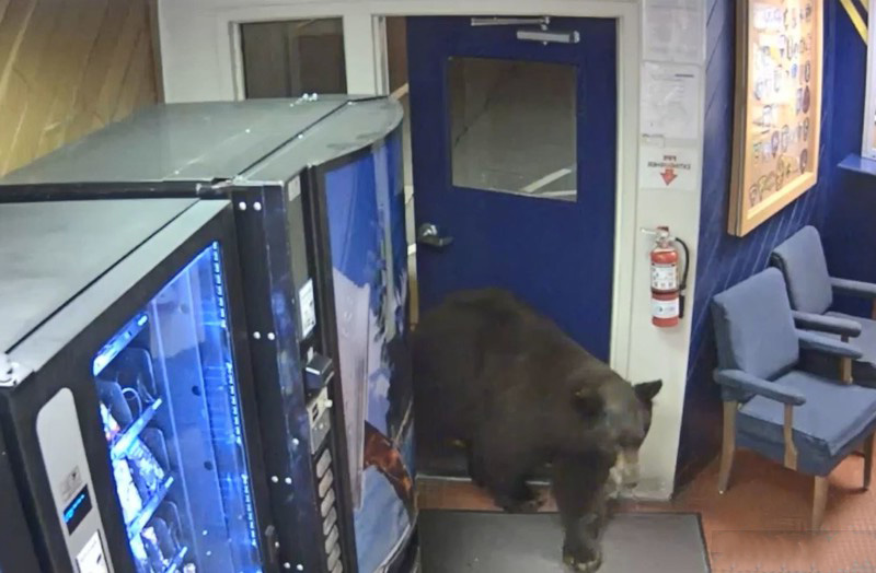 ▼牠在裝滿零食和飲料的自動販賣機邊徘徊一番,就往更裡面去了。這隻熊動作慢悠悠的,態度悠閒,在警局內玩了一會兒後,才順著進來的門走出去。