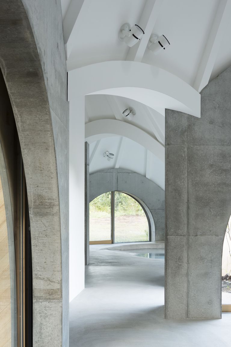 ▼小屋外形是帳篷的模樣,但內部結構以方形為主,四方出入口是圓拱造型。簡約的白色天花板搭配水泥色牆面和地板,整體的風格非常純淨。