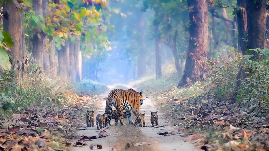 ▼虎媽帶著5隻活潑可愛的虎寶寶,在達德瓦國家公園(Dudhwa National Park)的一條林間小路上漫步。牠們的背影看起來悠閒自在,跟周圍的環境配合,構成了一幅唯美的畫。一般來說,虎媽一次會養育2到3隻小老虎,一次帶著5隻的情況很少見,所以Kaswan才那麼驚喜。