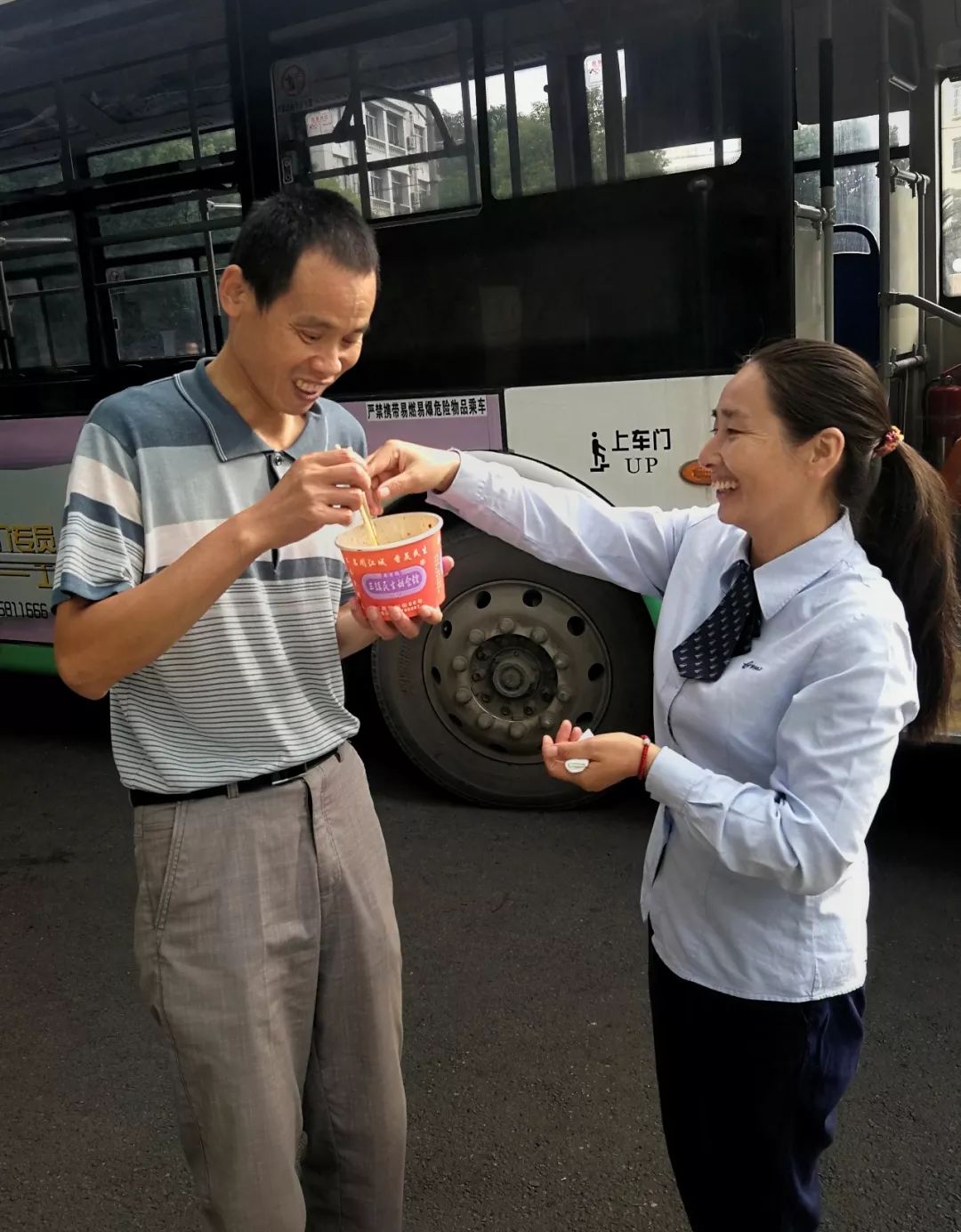 ▼張貴週透露:「每次從起點站發車前,她都會提前撥電話給我,告訴我具體的發車時間,好方便我掐點出門走到車站候車。」早上六七點路上一般不會堵車,為了提醒他上車,楊保鳳每次開車快到站時都會提前連續閃燈提示。這是他們之間的暗號,看到連續閃燈的那班公車進站,上車準沒錯。