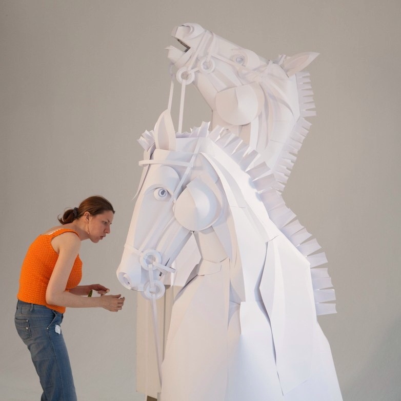 ▼他們還會用紙做國際象棋中的馬雕塑,這紙雕塑比人還要高!