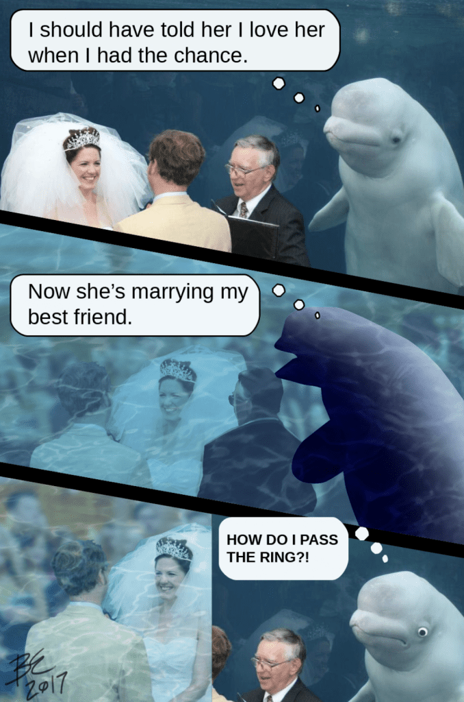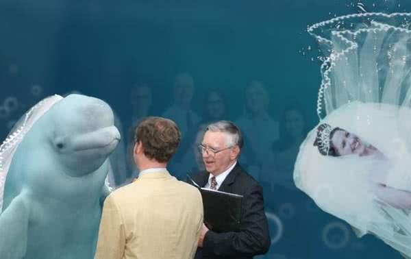 ▼當時這對新人正在宣誓,一隻白鯨突然出現在他們身後,面帶微笑見證了這浪漫的一刻。這有趣的一幕被拍下來後引發不少網友PS修圖。比如這張圖中,白鯨就成為了新人的伴郎,牠在想:「我應該早告訴她我愛她。現在她跟我最好的朋友結婚了。我該怎麼把戒指遞過去呢?」
