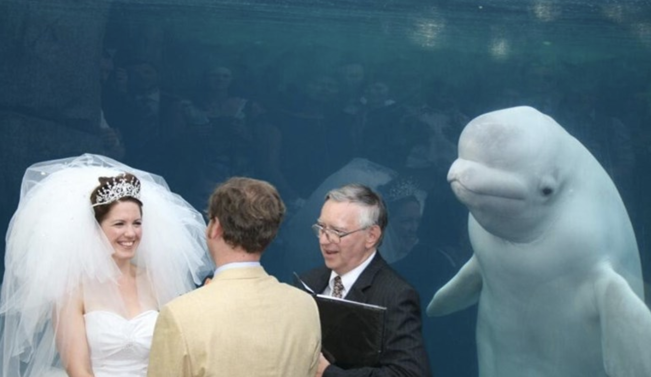 2021年09月16日沒有人希望婚禮上出現不速之客,但美國康乃狄克州(Connecticut)一對新人在水族館舉辦婚禮時,一隻白鯨突然現身,站在他們身後搶鏡。白鯨搶走了新人的風頭,但沒有人不高興,這張獨特的婚禮照片還成為了獨特的回憶,在網路上引發討論。