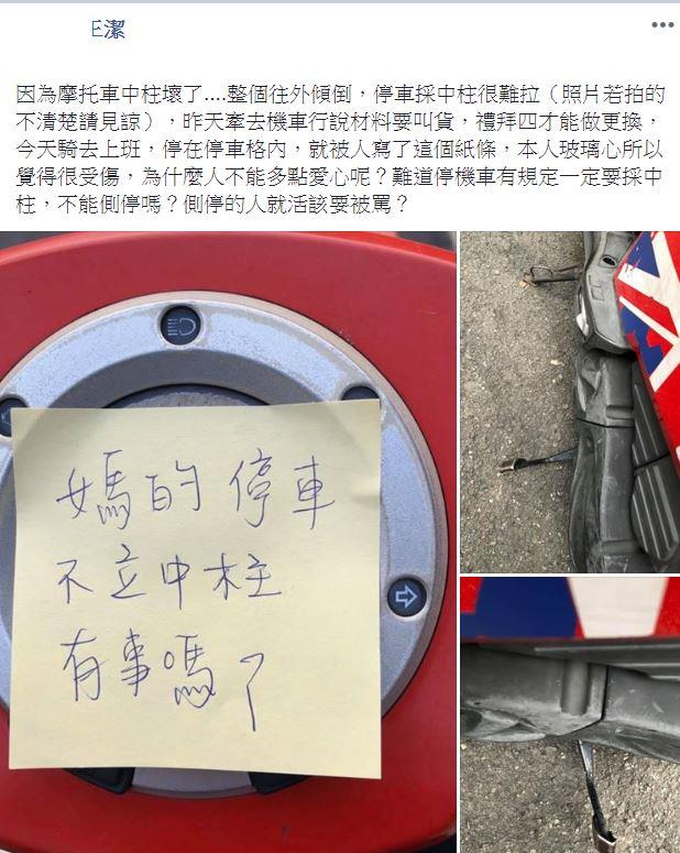 ▼有路人在原po的機車上留下一張紙條,上面寫著:「媽的,停車不立中柱有事嗎?」原po感覺很受傷,無奈說:「難道停機車有規定一定要踩中柱,不能側停嗎?側停的人就活該要被罵?」