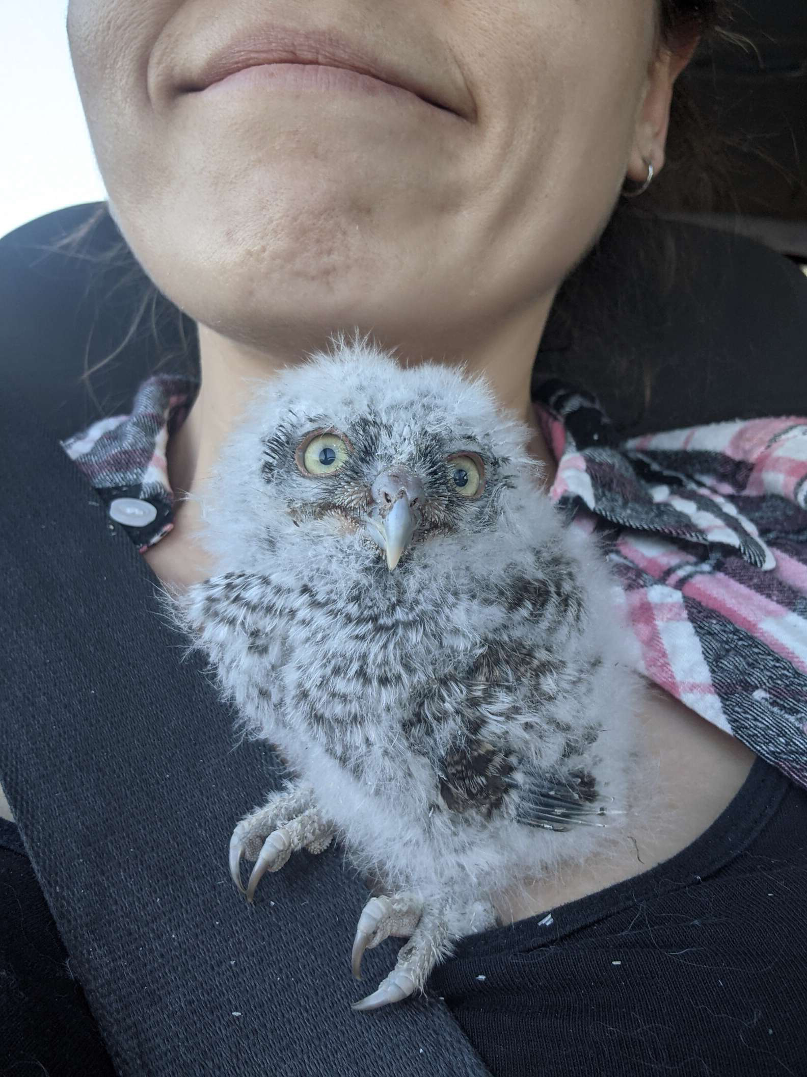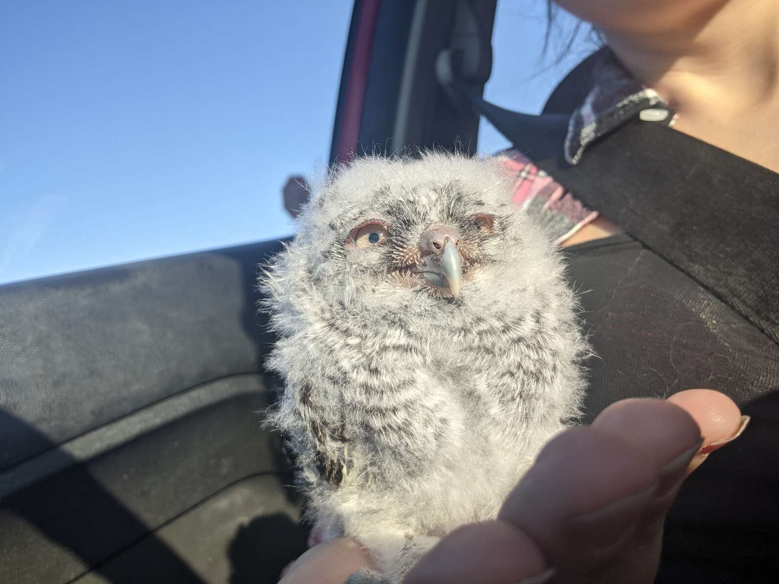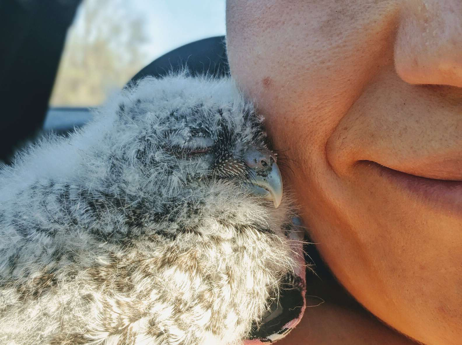 ▼Nikki用毛巾將這隻東美角鴞寶寶包起來放到紙箱中,並用車上的加熱坐墊幫牠保暖。開車前往復育中心途中,這個小傢伙一直想從紙箱裡爬出來。後來牠竟爬到Nikki的肩膀上,不停磨蹭她的臉頰,好像在跟她撒嬌。