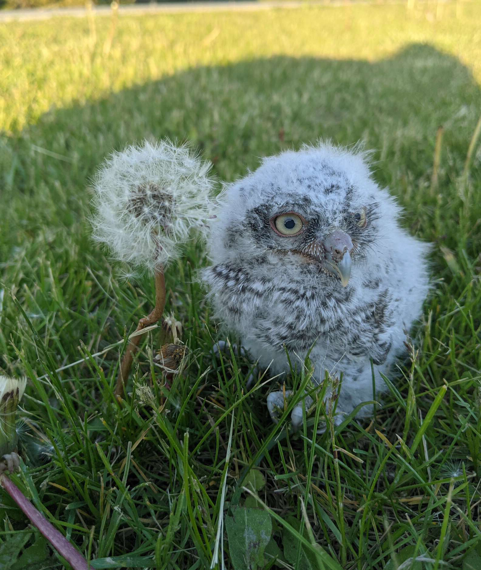 ▼那是一隻東美角鴞寶寶,牠可能是從窩裡掉了下來,因為剛剛出生沒多久,還不會飛,只能可憐兮兮待在草地上。Nikki環顧四周,沒看到鳥窩或樹洞。東美角鴞寶寶一直在發抖,Nikki決定先救牠,於是撥電話向同事求助。
