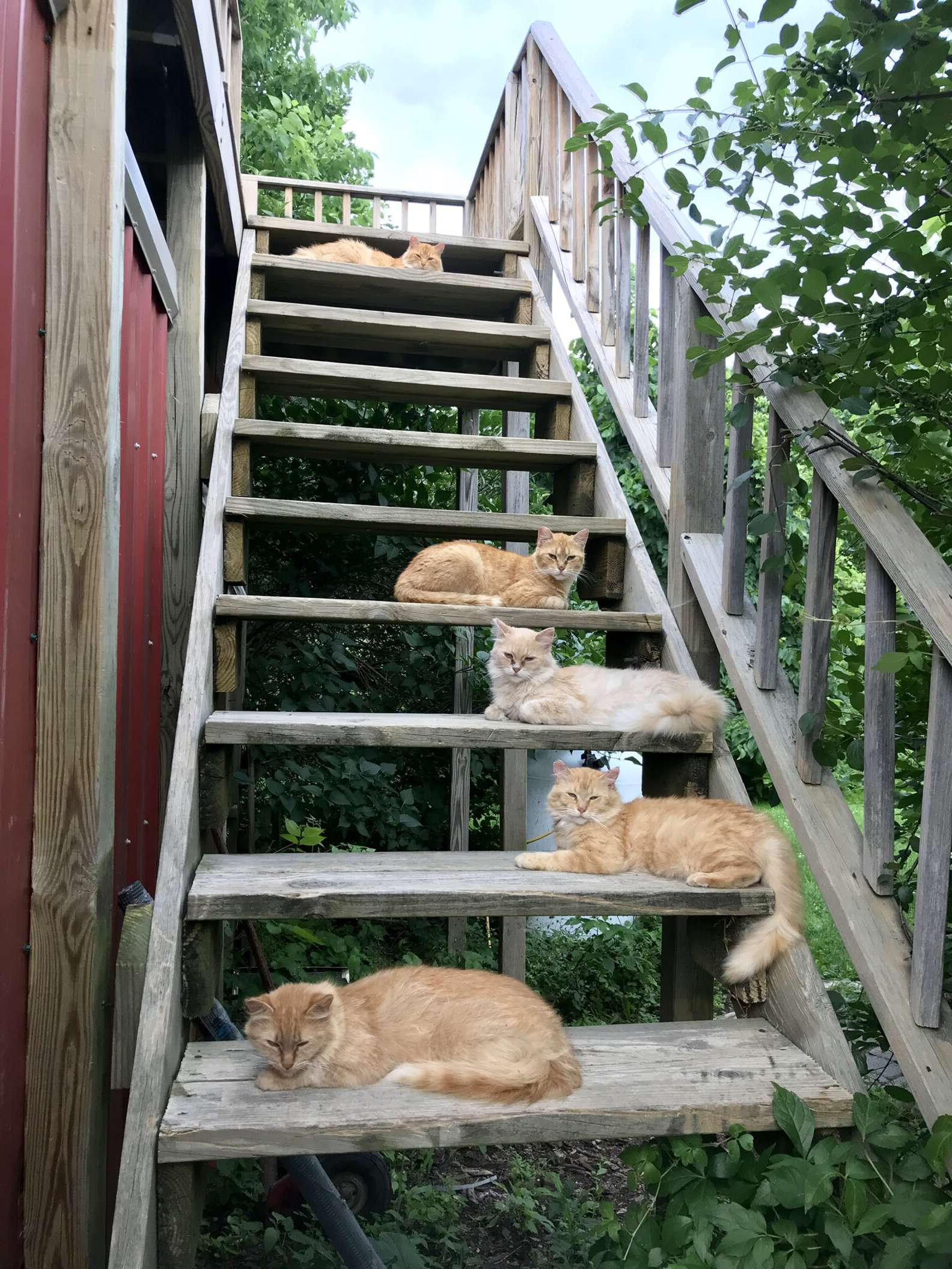 ▼Emily說:「跟這麼多貓咪一起生活很幸福!每次我走出房門,都會有貓咪來歡迎。有2隻貓咪會一直跟著我,每次我搖零食袋,牠們都會開心地跑過來。我去取郵件時,一路上會有一群貓咪跟著。」