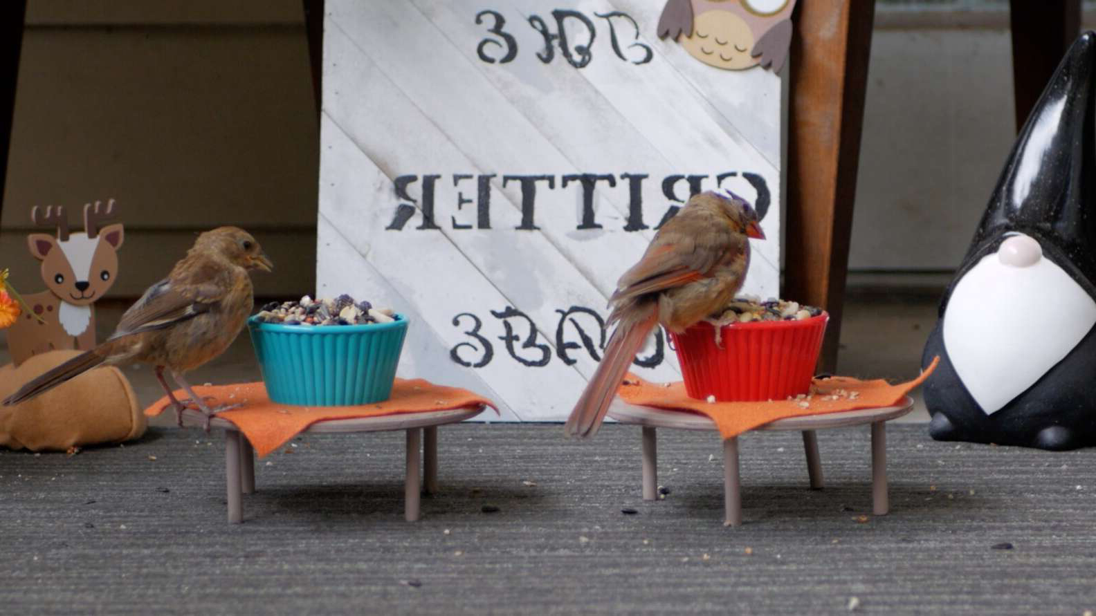 ▼Aby表示:「Pumpkin非常喜歡看小鳥和小松鼠吃東西,有時候會盯著餵鳥器看一整天。我們見牠看得那麼認真,突然有了一個想法,那就是把門廊設計成迷你咖啡廳,招待附近的小動物,是不是會很有趣?」