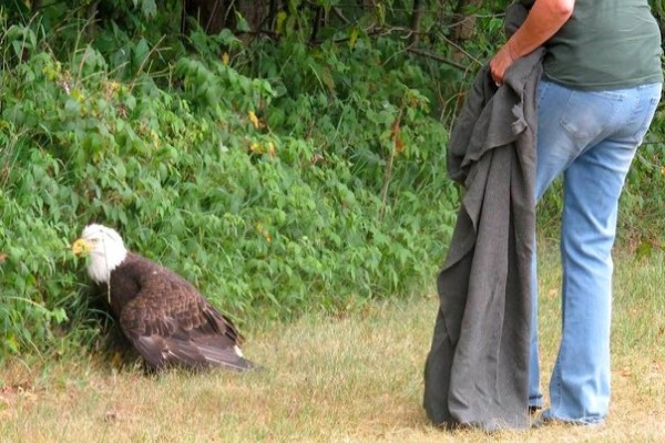▼「Raptor Education Group」的工作人員很快趕到現場,果然找到了一隻瘦弱的白頭海鵰。牠飛不起來,只能躲在草叢裡,看起來很狼狽。工作人員迅速將牠帶回去檢查、治療。
