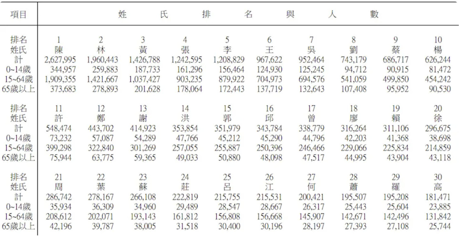 2021年09月23日全台姓氏眾多,其中有一些令人非常驚奇。日前一名網友在Dcard上分享內政部編撰的《全國姓名統計分析》,這份資料共收錄全台1832個姓氏,前10名分別為「陳、林、黃、張、李、王、吳、劉、蔡、楊」。其中「陳」是全台第一大姓,共有262萬7995人~