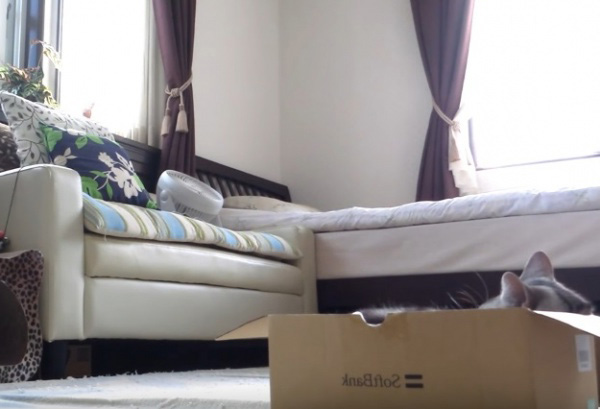 ▼Ame先是玩玩具,玩累了就窩到紙箱裡睡覺。牠睡醒後發現馬麻還沒有回來,於是跑到窗邊張望:「馬麻怎麼還沒回來?比平時要晚啊。」