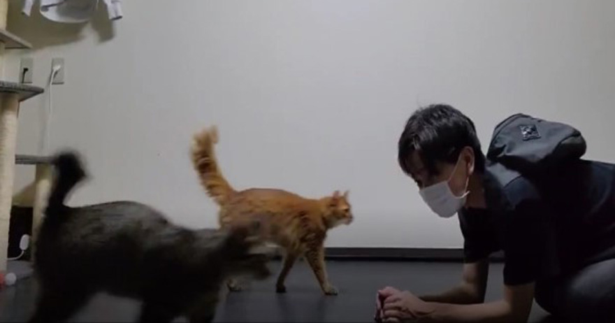 平時推主回家時,只要她彎下腰、把臉調到貓咪的高度,Shipi和Okome就會過來蹭蹭她,用這樣的方式迎接她回家。沒想到那天她下班回家,開開心心趴在地上向貓咪們求抱抱、求蹭蹭時,2隻貓咪竟一左一右從她身邊走過,連眼神都沒有給她,這讓她當場傻眼。