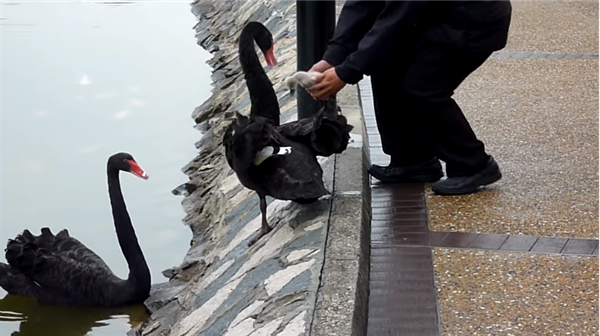 ▼天鵝爸媽非常無奈,牠們待在水中,無助地向人類發出求助信號,希望人類再幫忙將寶寶放到水中。在大家的鼓勵和支持下,天鵝寶寶終於鼓起勇氣進入水中。牠其實很會游泳,在天鵝爸媽身邊游來游去,看起來非常開心。