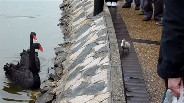 ▼天鵝媽媽見寶寶不願意下水,就走上岸哄牠。天鵝父母跟叛逆的寶寶僵持不下,不知不覺間吸引了一大群路人圍觀。一名好心的年輕人直接抱起天鵝寶寶,慢慢將牠放到水中。大家本以為天鵝寶寶終於下水,要開始學習游泳了,沒想到牠竟然又跑回岸邊。