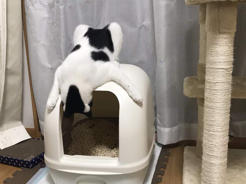 想看看自己便便狀態的心情可以理解,但爬到貓砂盆上去觀察就太誇張啦。「オズ」真是一隻不一般的小貓呢~