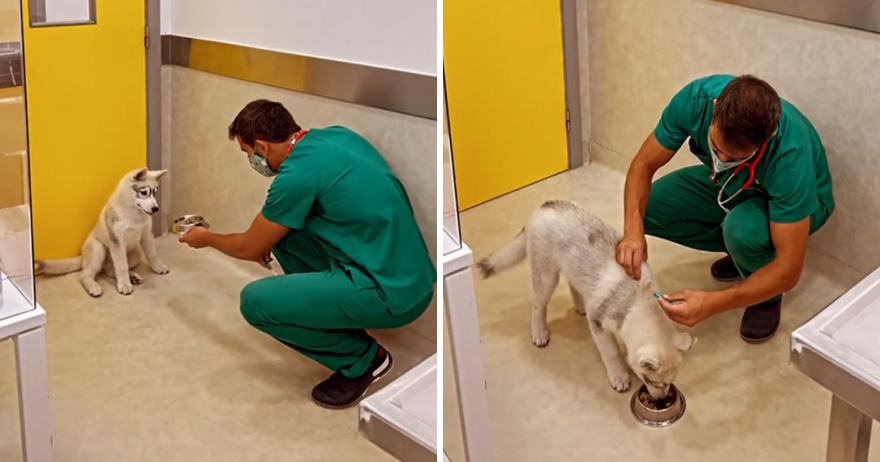 ▼這天有一隻哈士奇幼犬來獸醫院打預防針,牠站在門口,顯得非常緊張害怕。Santos拿出香噴噴的肉肉,在牠面前畫圈圈吸引牠的注意。狗狗果然無法抵擋肉肉的誘惑,馬上跑過來吃起來。Santos趁機牽起狗狗的手,給牠注射疫苗。狗狗竟沒有意識到自己要打針了,吃完肉肉後還意猶未盡地看著空碗,好像沒吃夠。