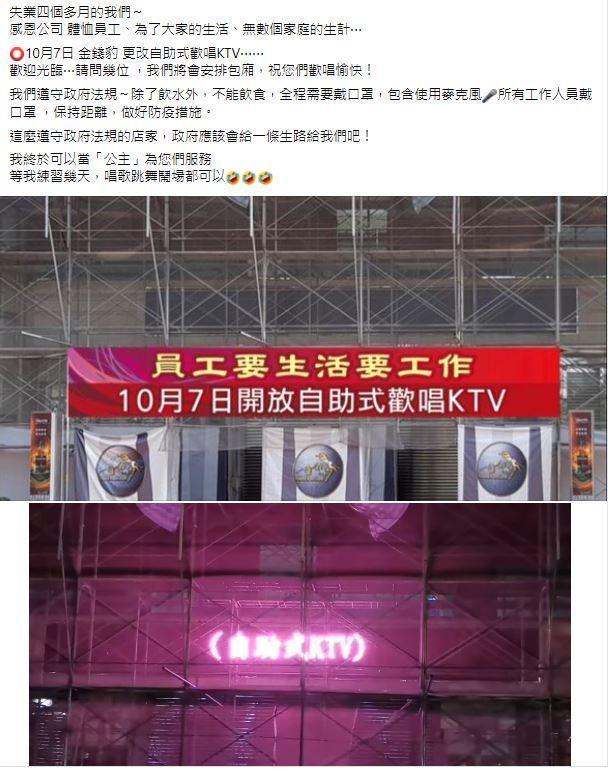 ▼KTV業者得知這一消息後,緊鑼密鼓地開始做準備,提前重啟塵封包廂,做好各項與防疫有關的清消作業。有網友在臉書po出一張金錢豹酒店的照片,只見外觀正在整修,還有紅布條寫道:「員工要生活要工作,10月7日起開放自助式歡唱KTV。」
