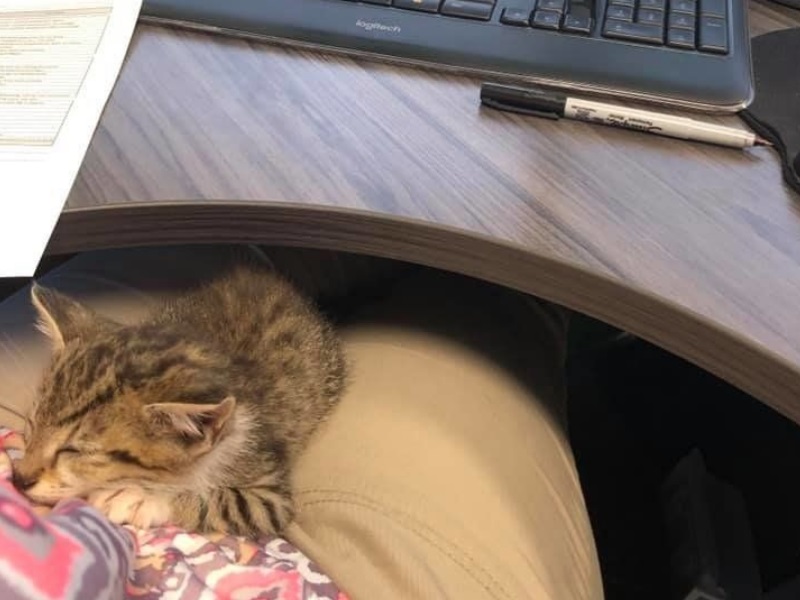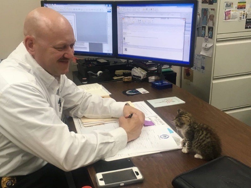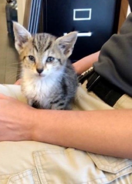 ▼警局局長非常愛貓,看到小貓後毫不猶豫伸出援手,並給牠取名為Moxie。局長帶Moxie去看獸醫,做完檢查後又把牠帶回警局照顧。剛開始他也想幫Moxie找新家,但Moxie實在太可愛,最後他還是決定收編牠,讓牠成為警局的「警貓」。