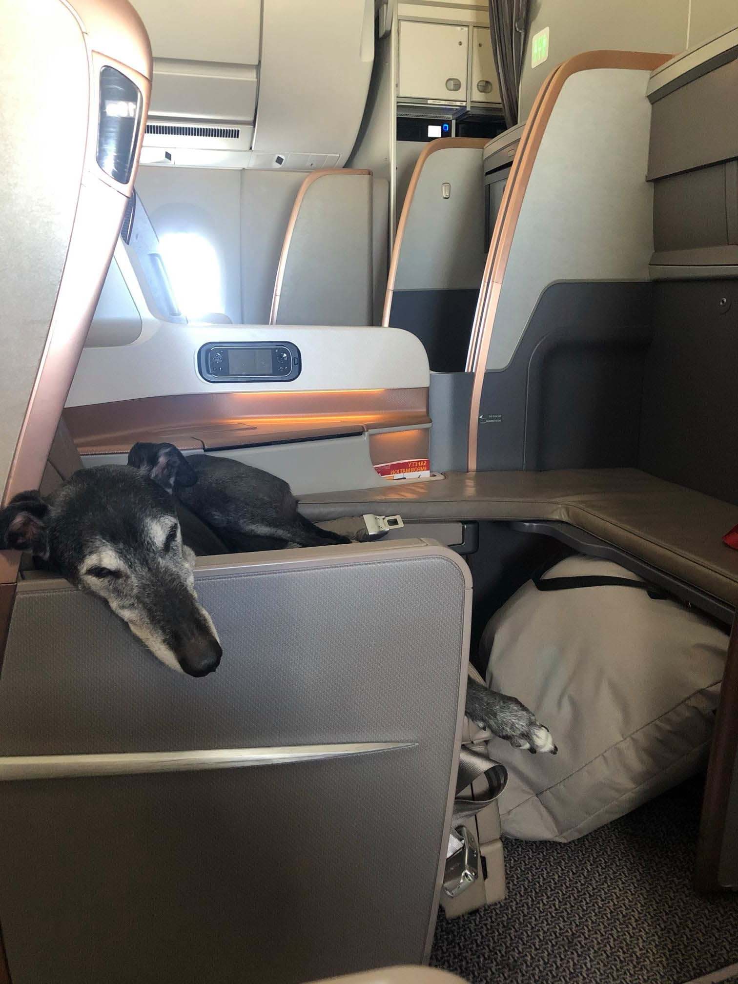 ▼Lewis的新主人從墨爾本搬到了義大利,所以Lewis要跟著主人一起去。依據新加坡航空的寵物旅行政策,Lewis本應該待在貨艙裡,不能跟主人一起進入客艙。但航空公司考慮到當天班機上的座位幾乎是空的,而且這是長途航班,就讓Lewis升級到商務艙,跟主人待在一起。