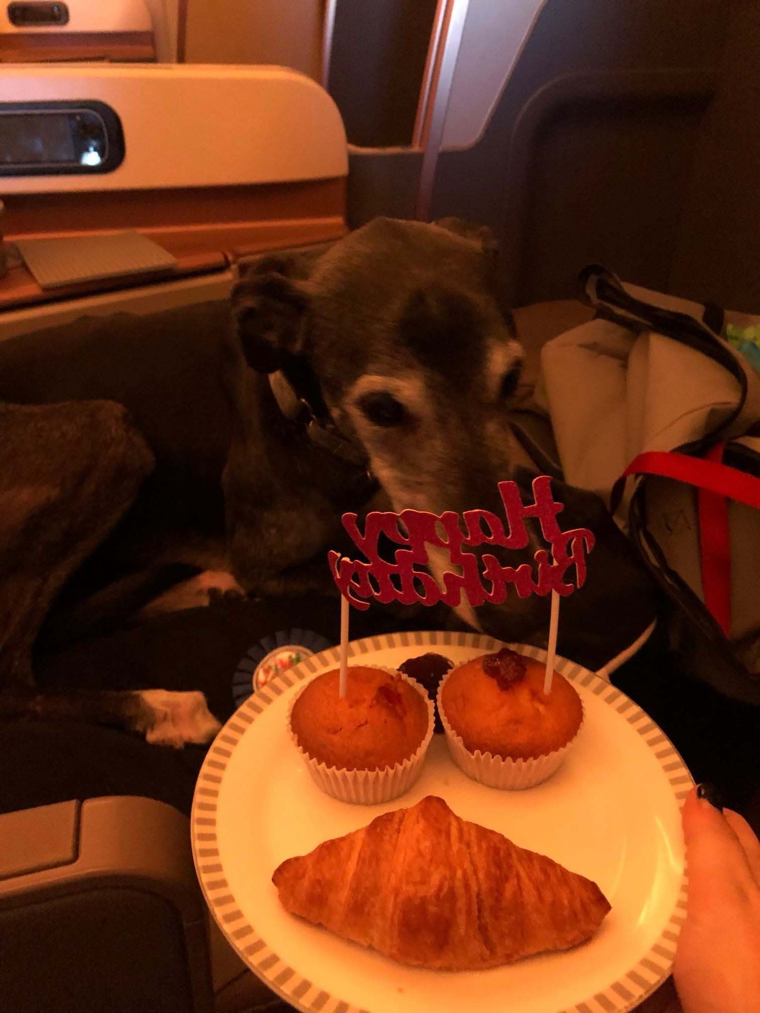 ▼航空公司還為Lewis準備了杯子蛋糕,替牠慶祝生日。Lewis在飛機上不受拘束,牠乖巧懂事,表現得非常好,全程都沒有吵鬧。
