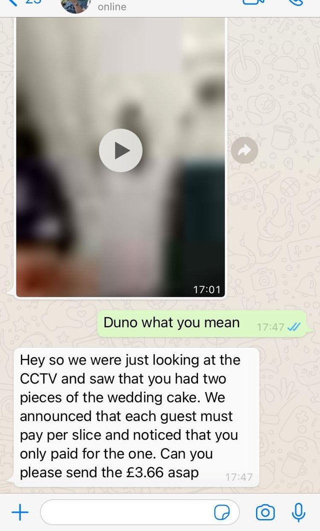 原po表示,他回家後收到新婚夫妻傳來的監視器畫面。當下他不清楚對方想表達什麼。那對新婚夫妻說,婚宴當天的蛋糕費用是每片3.66英鎊,原po只付了一片蛋糕的錢,但查看監視器後發現,原po多吃了一片蛋糕,所以應該多付這筆費用。