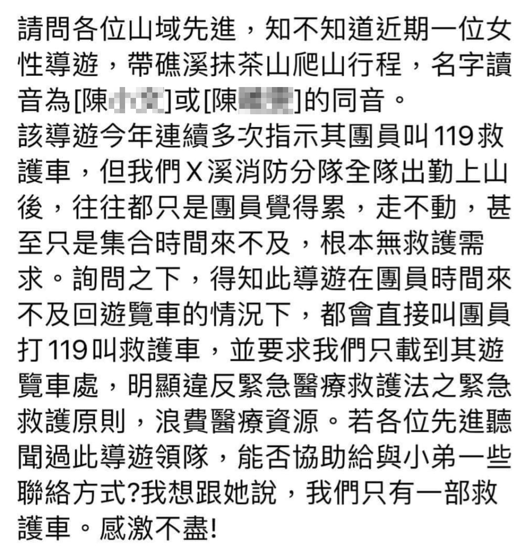 ▼有網友在臉書社團轉傳,指出近期有位陳姓女導遊,今年已多次在帶團登爬抹茶山時,指示其團員呼叫119救護車,等到救護消防隊員上山抵達後,才發現往往都是「團員覺得累、走不動」,或甚至「只是集合時間來不及」等狀況,根本不需要動用到救護車需求;在詳問狀況後,才得知該導遊會在團員來不及回遊覽車時,指示團員呼叫119,只為要求載團員回遊覽車的預定位置。