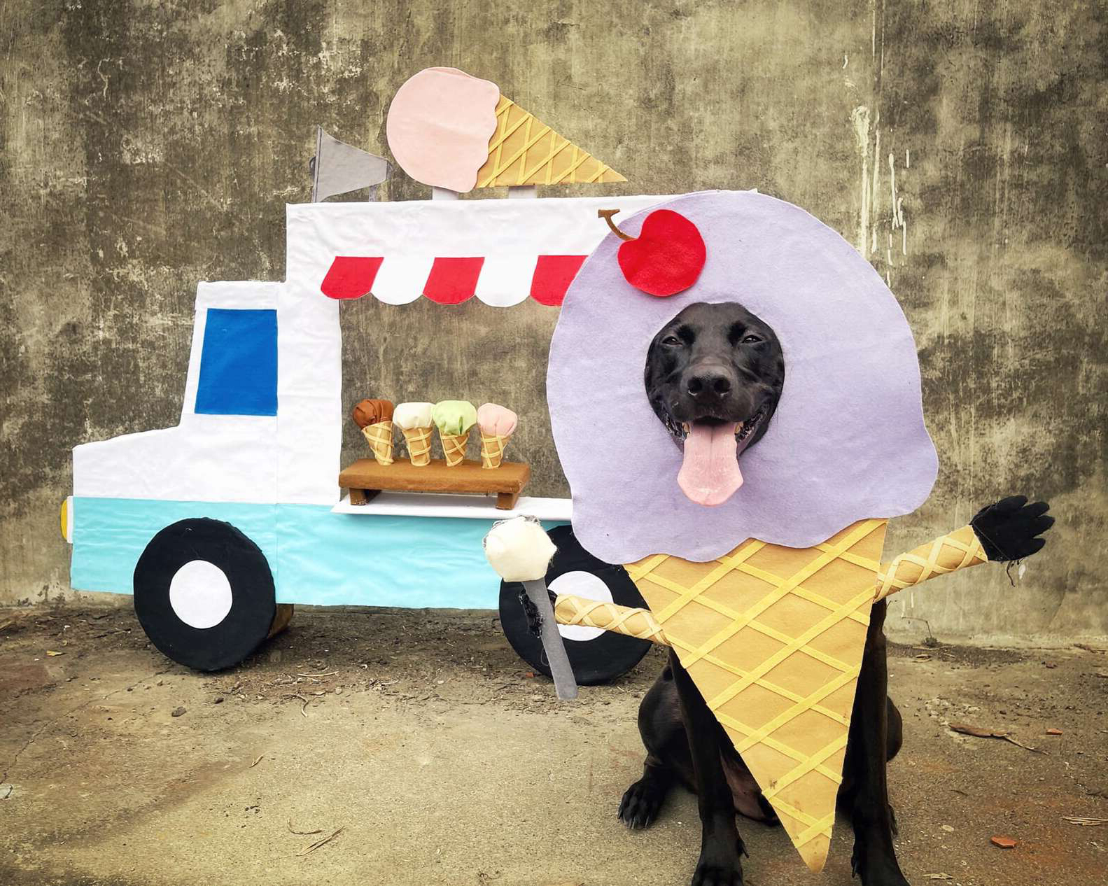 ▼Buster是把拔的最大粉絲!Steve說:「Buster不介意穿戴任何東西。有時候牠在照片中看起來很嚴肅,那是因為牠在看狗糧。牠對食物沒有抵抗力。」Buster對食物的愛大大激發了把拔的靈感,Steve製作了一系列食物主題的道具。