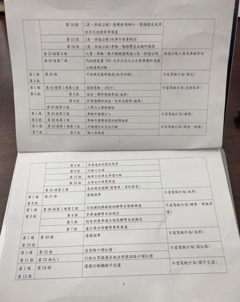 ▼根據交通部提出的46項開放民眾檢舉項目中,「動態違規」項目包括高、快速公路不當駕駛及裝載,如果未保持安全車距、未依規定變換車道,以及連續按喇叭變換燈光或其他方式迫使前車讓道等;也包括不當駕駛行為如危險駕駛、兩車以上競駛等樣態。
