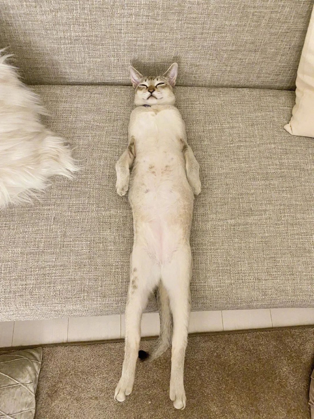 ▼貓咪直挺挺躺在沙發上,腿伸得直直的,兩隻手手則平放在腰間。牠全身的毛色是灰白帶深一點的斑點,這睡姿、體型和毛色,乍看一下還以為是一隻小海豹。