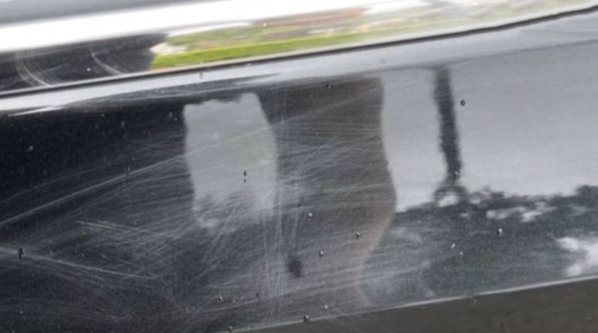 ▼洗車員用菜瓜布沾水洗車,最初看不太出有被刮過的痕跡,但車上的水乾掉後,就能清楚看到車身、車頂有很多交雜的白色刮痕,那些刮痕有深有淺,白花花一大片。車主看到後差點暈倒,到原廠烤漆估價要4萬多元。車主跟加油站聯絡時,洗車員要求他把車開回高雄處理,還表示「有些(刮痕)不是我弄的,怎麼沒一出加油站就反映?」