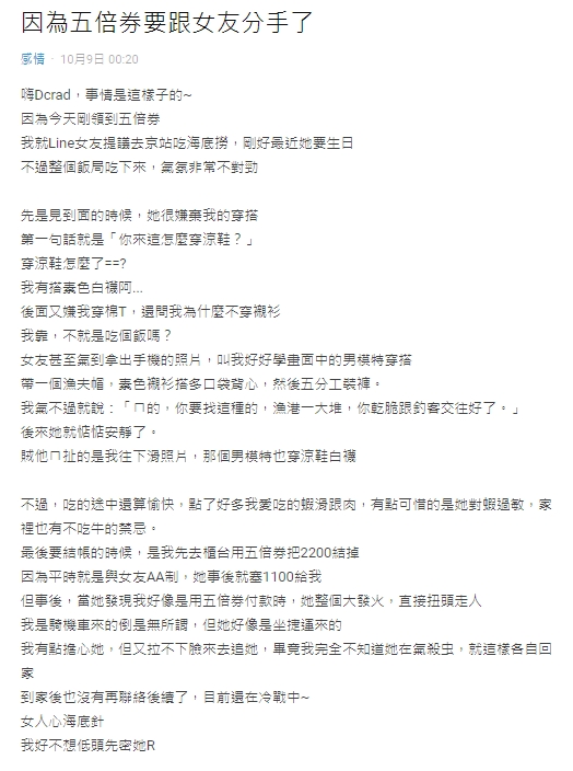 拿五倍券爽吃生日大餐!女友氣炸翻臉走人 他嘆:女人心海底針