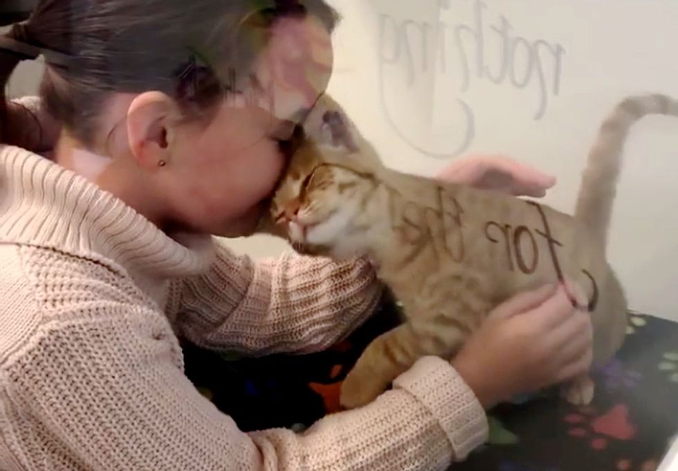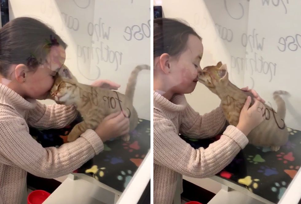 ▼8周後,這隻小奶貓來到收容所,等待被領養。有一天一個叫Shelby的小女孩到收容所幫忙。身為小小志工的她非常喜歡動物,也很愛跟動物們相處。那隻小奶貓可能感覺到了Shelby的友善,竟主動湊過來靠著她的臉頰不停磨蹭,Shelby的心都要被融化了。