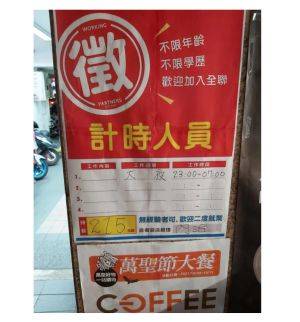 這名男網友在Dcard上以「全聯有大夜?!」為題發文。他表示自己本來要去全聯買一些吃的回家,結果一到就看到門口貼著一張徵計時人員的公告,而且工作週期是「大夜」、工作時段為23點至7點、時薪為215元。